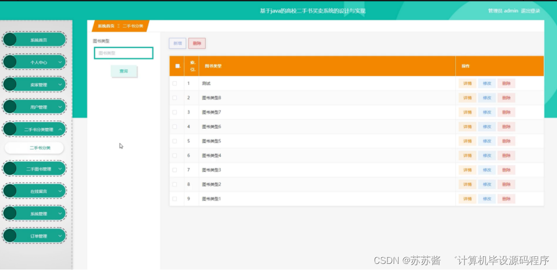 管理员点击二手书分类管理,进入二手书分类管理页面,管理员可通过输入图书类型进行查询、新增、删除的操作,并可对图书类型进行查看详情、修改、删除等操作。如图5-14所示: