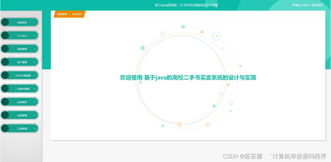 管理员进入主页面,主要功能包括对首页、个人中心、卖家管理、用户管理、二手书分类管理、二手图书管理、在线留言、系统管理、订单管理等进行操作。管理员主页面如图5-10所示: