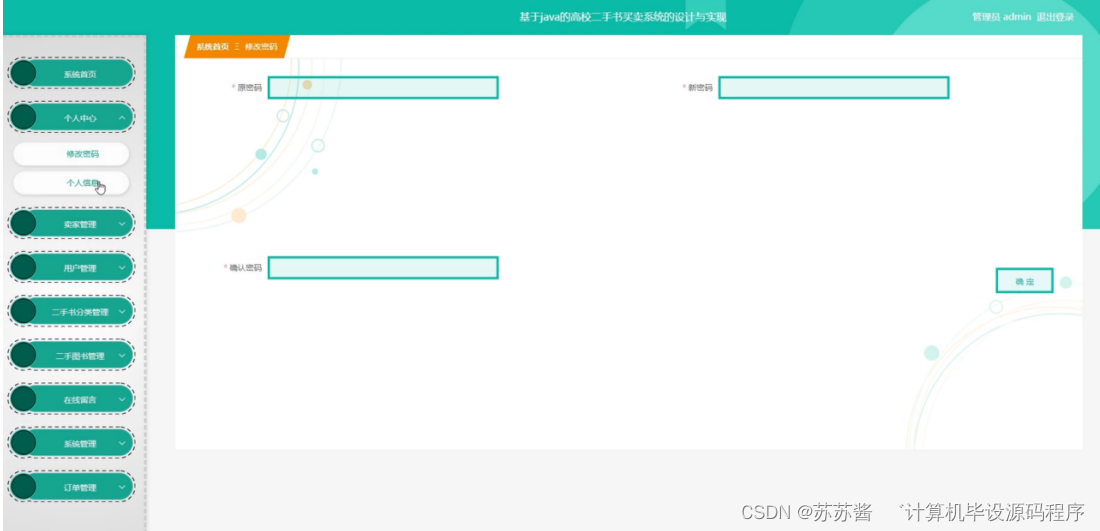 管理员点击个人中心,进入个人中心界面,管理员可查看并修改个人信息及修改密码等操作;如图5-11所示: