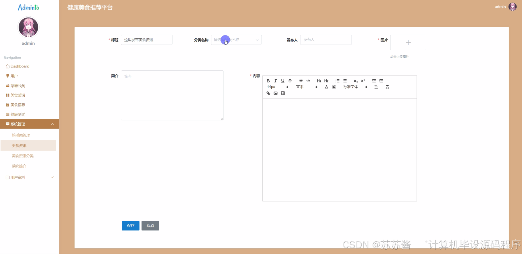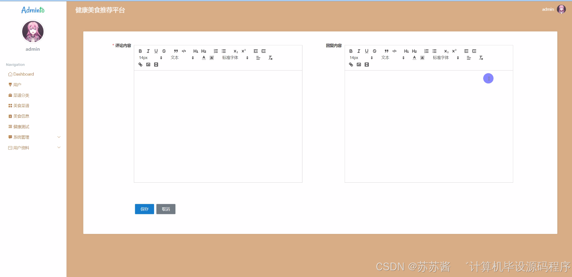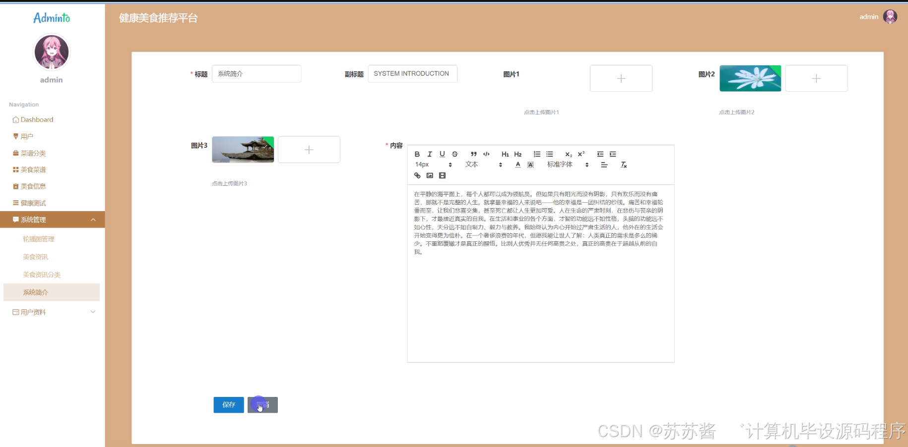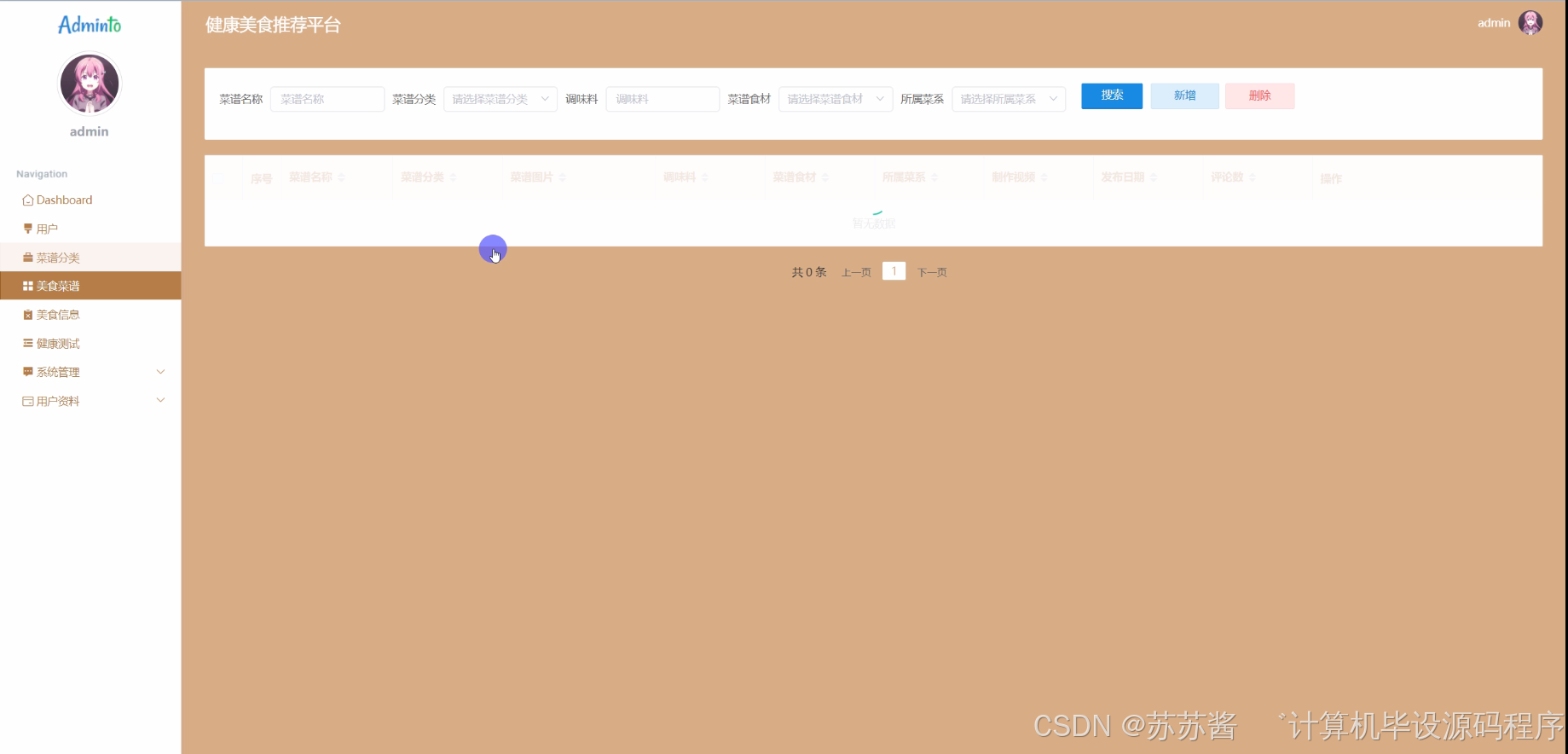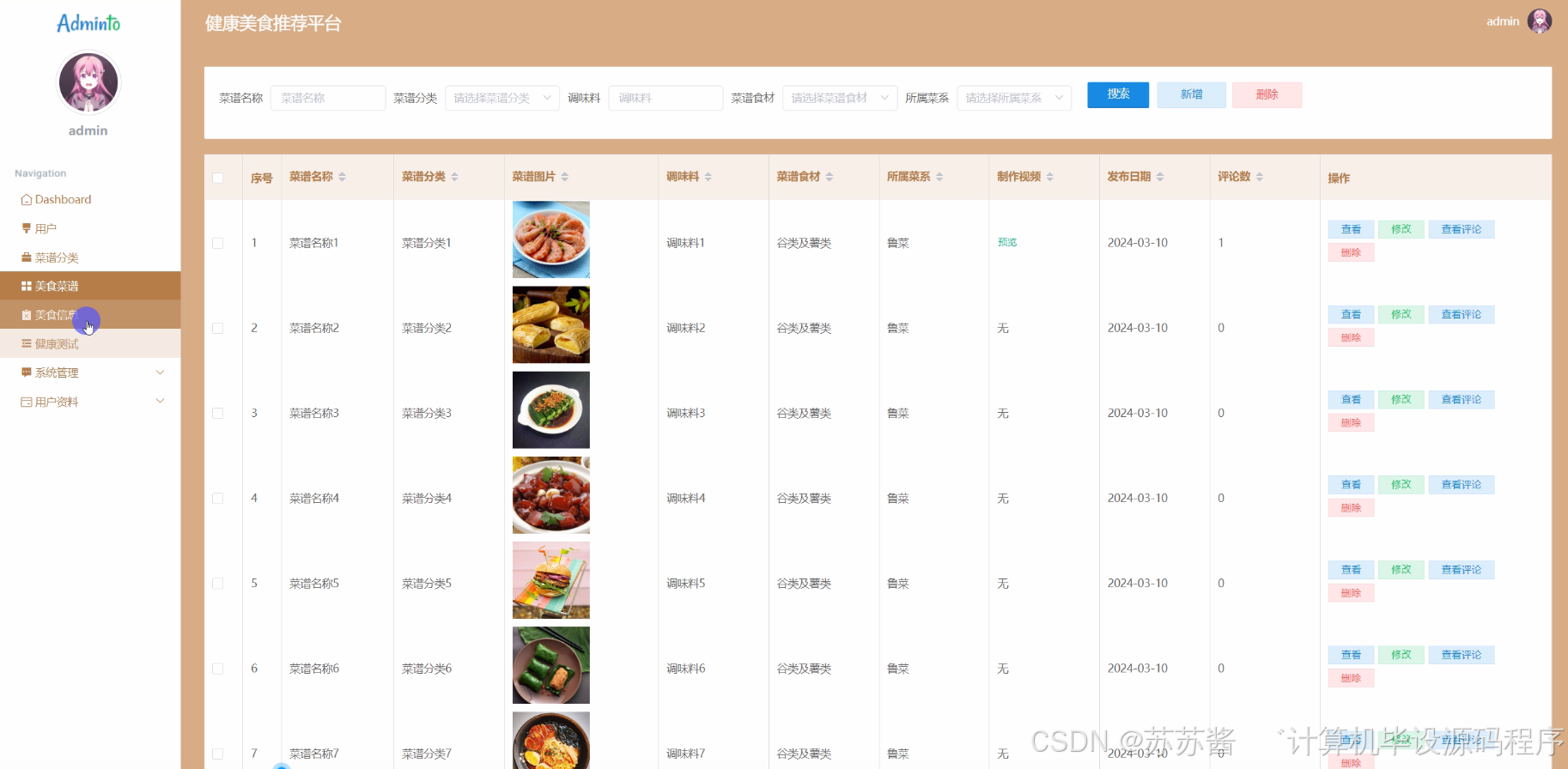 - 用户系统:构建用户注册、登录、信息管理及偏好设置模块。通过收集用户的基本信息(如年龄、性别、健康状况等)、历史行为(如浏览记录、收藏记录等)数据,形成详尽的用户画像。这有助于了解用户的健康需求和美食偏好,为个性化推荐提供依据。