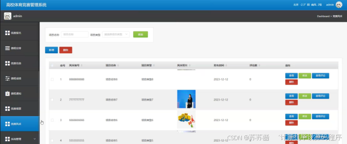 管理员点击竞赛风采:在竞赛风采页面输入项目名称和项目类型进行搜索、新增或删除竞赛风采列表,并根据需要对竞赛风采进行查看、修改、查看评论或删除操作;如图5-21所示: