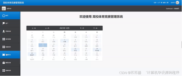 管理员进入主界面,主要功能包含个人中心、用户、学院信息、项目类别、竞赛项目、竞赛报名、赛程安排、竞赛信息、赛程成绩、赛程通知、竞赛规章、竞赛风采、系统管理和用户资料等进行管理;如图5-11所示。