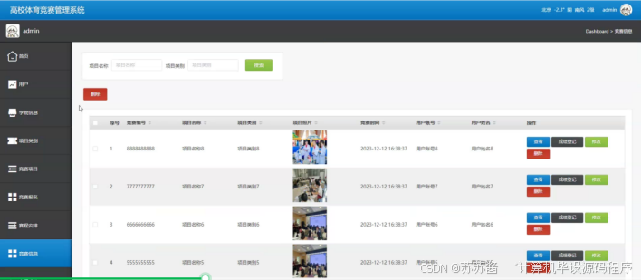管理员点击竞赛信息:在竞赛信息页面输入项目名称和项目类别进行搜索、或删除竞赛信息列表,并根据需要对竞赛信息进行查看、成绩登记、修改或删除操作;如图5-18所示: