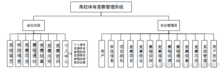 管理员模块属于是网站的后台,进入之后有大量的管理员功能,管理员也可以使用其他用户模块的功能,为了维护网站的稳定与页面的布局,将管理员模块的功能详细化后可以使用系统管理对页面进行布局修改,可以发布公告提示用户规范,高校体育竞赛管理系统总体结构如图4-2所示。