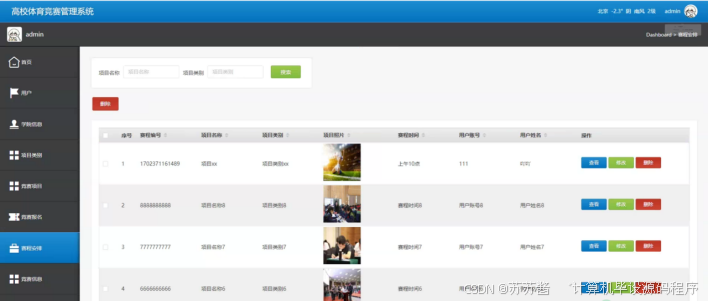 管理员点击赛程安排:在赛程安排页面输入项目名称和项目类别进行搜索或删除赛程安排列表,并根据需要对赛程安排详情信息进行查看、修改或删除操作;如图5-17所示:
