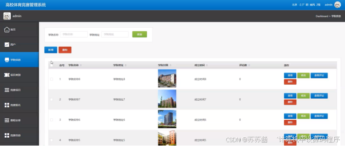 管理员点击学院信息:在学院信息页面输入学院名称和学院地址进行搜索、新增或删除学院信息列表,并根据需要对学院信息进行查看、修改、查看评论或删除操作;如图5-13所示: