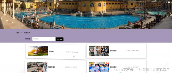竞赛规章:在竞赛规章页面的输入栏中输入规章标题进行查询,可以查看到竞赛规章详细信息,并根据需要进行操作;竞赛规章页面如图5-6所示: