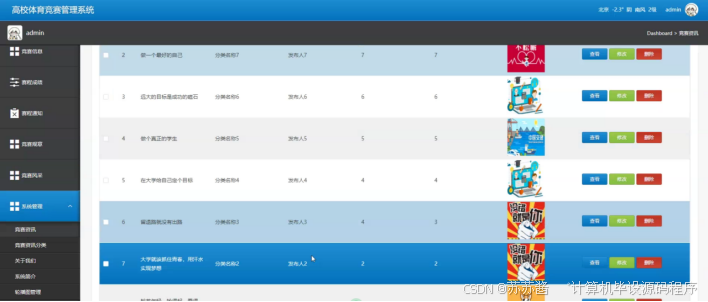 管理员点击系统管理:在系统管理页面点击下拉菜单呈现出竞赛资讯、竞赛资讯分类、关于我们、系统简介、和轮播图管理等菜单,并根据需要对子菜单进行查看、修改或删除操作;如图5-22所示: