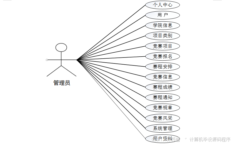 (1)管理员关键功能包含个人中心、用户、学院信息、项目类别、竞赛项目、竞赛报名、赛程安排、竞赛信息、赛程成绩、赛程通知、竞赛规章、竞赛风采、系统管理和用户资料等进行管理。管理员用例如下: