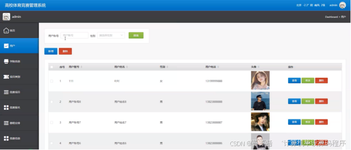 管理员点击用户:在用户页面输入用户帐号、性别进行搜索、新增或删减用户列表,并根据需要对用户详情信息进行查看、修改或删除操作;如图5-12所示: