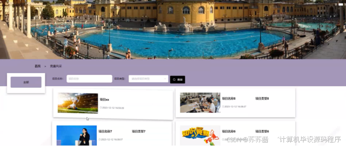 竞赛风采:在竞赛风采页面的输入栏中输入规章标题、项目名称、项目类型进行查询,可以查看到竞赛风采详细信息,并根据需要进行操作;竞赛风采页面如图5-7所示: