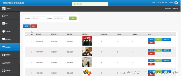 管理员点击竞赛项目:在竞赛项目页面输入课程项目名称和项目类别进行搜索、新增或删除竞赛项目列表,并根据需要对竞赛项目详情信息进行查看、修改、查看评论或删除操作;如图5-15所示: