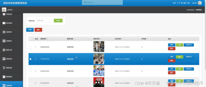 管理员点击竞赛规章:在竞赛规章页面输入规章标题进行搜索、新增或删除竞赛规章列表,并根据需要对竞赛规章进行查看、修改、查看评论或删除操作;如图5-20所示: