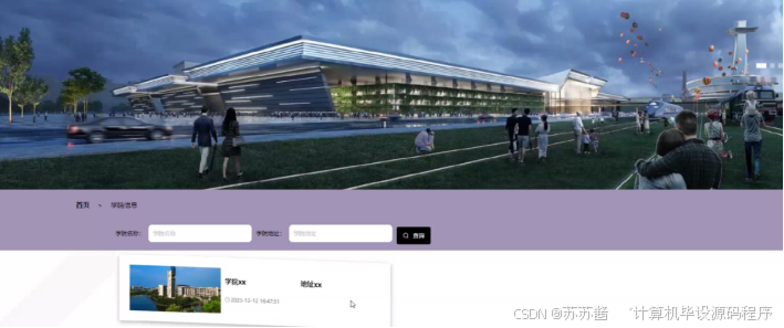 学院信息:在学院信息页面的输入栏中输入学院名称和学院地址进行查询,可以查看到学院信息详细信息,并根据需要进行评论或收藏操作;学院信息页面如图5-3所示: