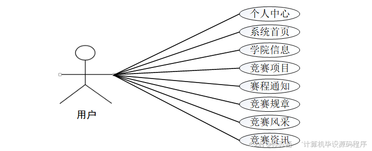 (2)用户关健功能包含个人中心、系统首页、学院信息、竞赛项目、赛程通知、竞赛规章、竞赛风采、竞赛资讯等进行管理。用户用例如下: