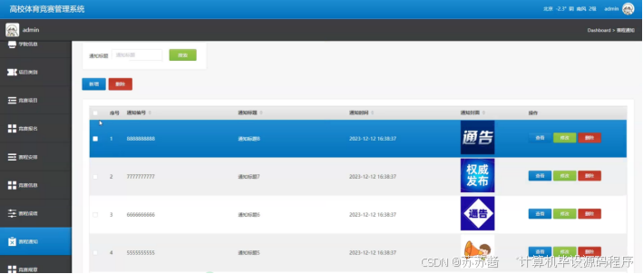 管理员点击赛程通知:在赛程通知页面输入通知标题进行搜索、新增或删除赛程通知列表,并根据需要对赛程通知进行查看、修改或删除操作;如图5-19所示: