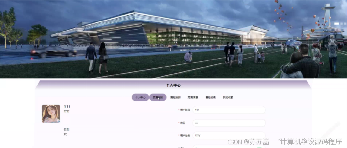个人中心:在个人中心页面通过填写个人详细信息进行更新操作,还可以对竞赛报名、赛程安排、竞赛信息、赛程成绩和我的收藏进行详细操作;如图5-9所示: