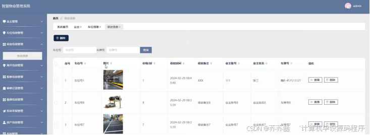 管理员进入主页面,主要功能包括对业主管理、车位信息管理、停放信息管理、离开信息管理、报修信息管理、维修记录管理、缴费信息管理、投诉举报管理、房产信息管理、系统管理、个人中心等进行操作。管理员主页面如图5-6示: