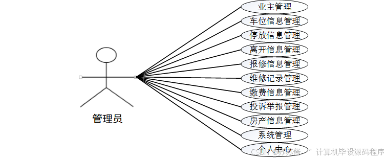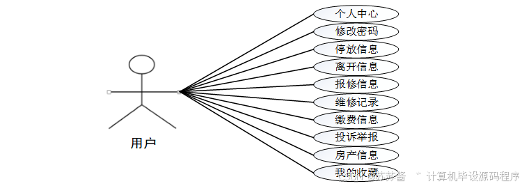 (2)用户关键功能包含个人中心、修改密码、停放信息、离开信息、报修信息、维修记录、缴费信息、投诉举报、房产信息、我的收藏等进行详细操作。用户用例如下: