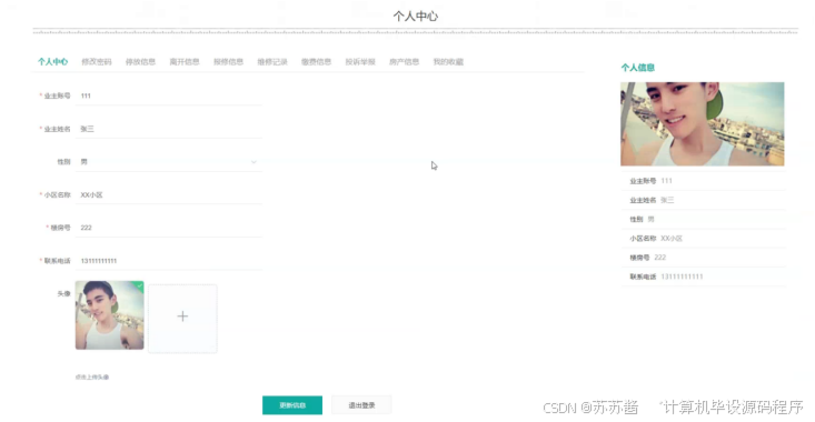 个人中心:在个人中心页面可以对个人中心、修改密码、停放信息、离开信息、报修信息、维修记录、缴费信息、投诉举报、用户信息、我的收藏等功能进行操作;如图5-4所示: