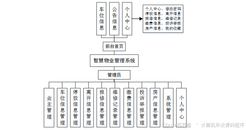 智慧物业管理系统按照权限的类型进行划分,分为管理员和用户共两个模块。系统实现业主管理、车位信息管理、停放信息管理、离开信息管理、报修信息管理、维修记录管理、缴费信息管理、投诉举报管理、房产信息管理、系统管理、个人中心等功能进行操作,增强了使用者的操作体验。管理员模块主要针对整个系统的管理进行设计,提高了管理的效率和标准。系统的总体模块设计如下图所示: