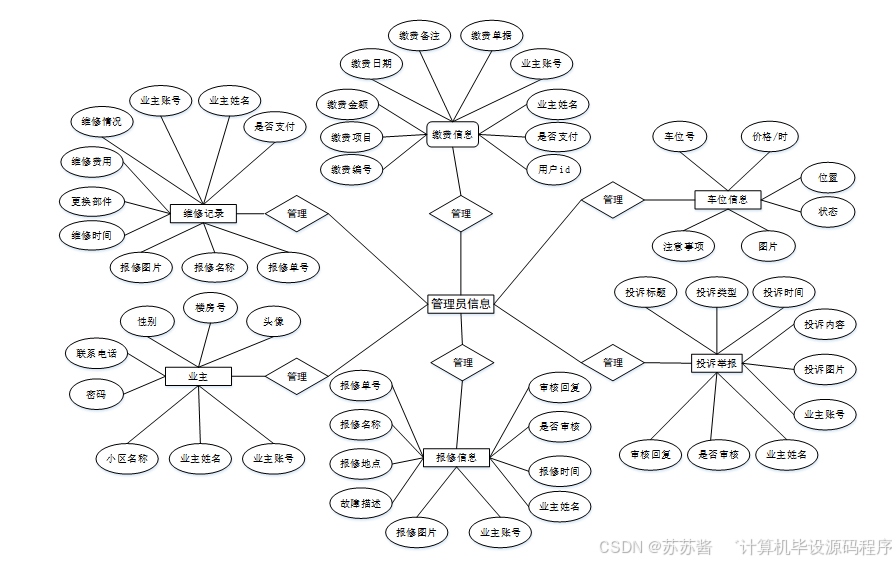 信息世界的基本要素包括实体和关联。现实存在且彼此可区别的事物称为实体。实体可以是实际的人、事或物,还可以是抽象化的概念或联络。在系统中将“业主、维修记录、缴费信息、车位信息、投诉举报、报修信息”等作为实体,它们的局部E-R如图4-2所示。