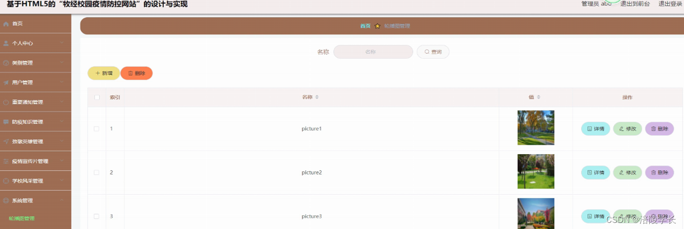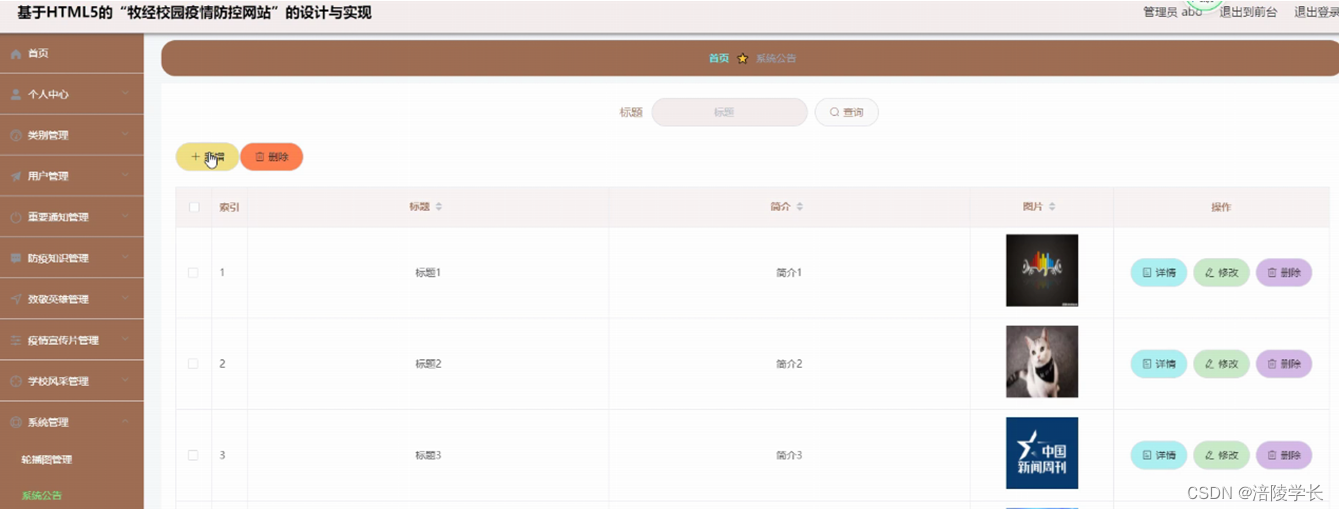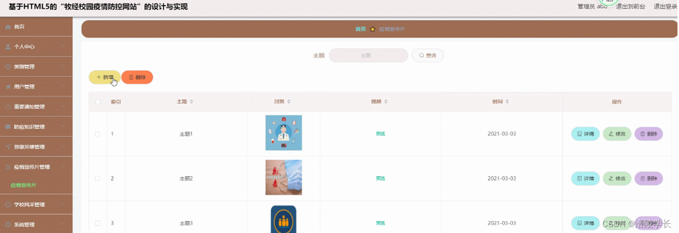 疫情宣传片管理,在疫情宣传片管理页面可以查看主题、封面、视频、时间等内容,并可根据需要对疫情宣传片管理进行添加,修改,删除或查询详细内容等操作,如图5-8所示。