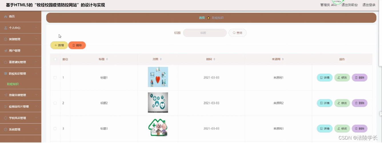 防疫知识管理,在防疫知识管理页面可以查看标题、封面、时间、来源网、内容等信息等进行添加、修改、删除等操作,如图5-6所示。