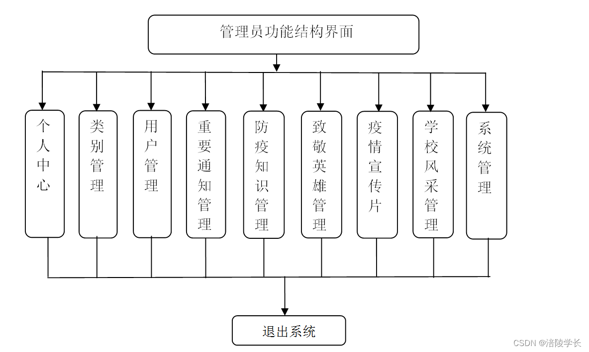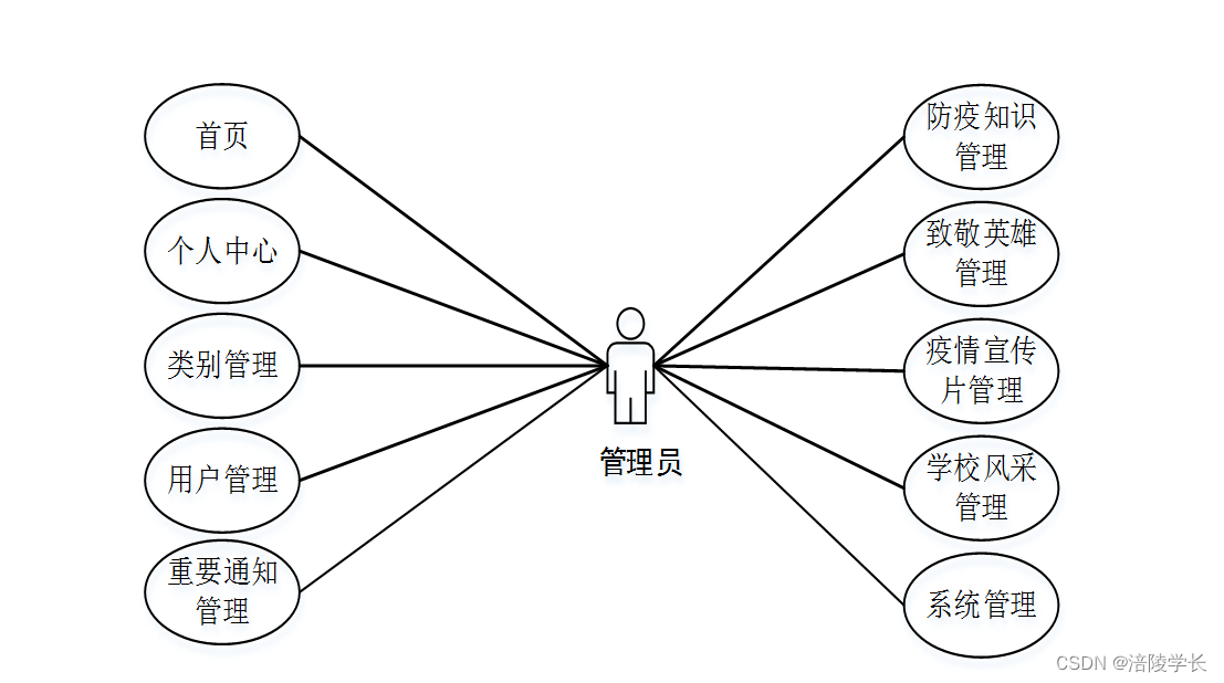 管理员登录进入基于HTML5的“牧经校园疫情防控网站”可以查看首页、个人中心、类别管理、用户管理、重要通知管理、防疫知识管理、致敬英雄管理、疫情宣传片管理、学校风采管理、系统管理等内容,如图5-3所示。