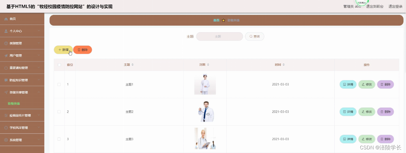 致敬英雄管理,在致敬英雄管理页面可以查看主题、封面、时间等内容,并可根据需要对致敬英雄管理信息进行添加,修改,删除或查询详细内容等操作,如图5-7所示。