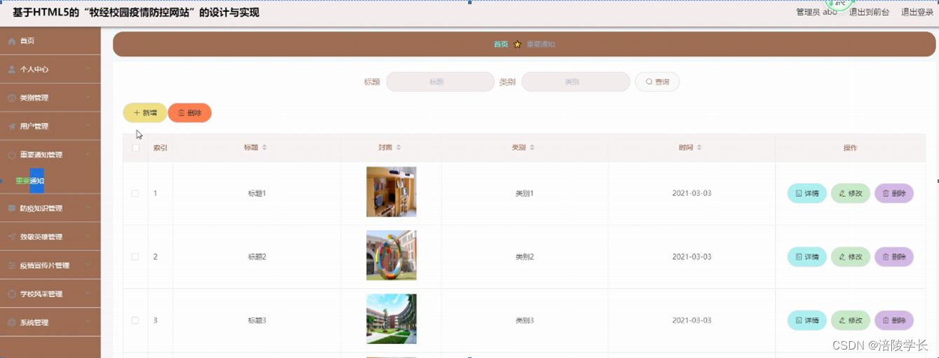 重要通知管理,在重要通知管理页面可以查看标题、封面、类别、时间等内容,并可根据需要对重要通知进行添加,修改或删除等操作,如图5-5所示。