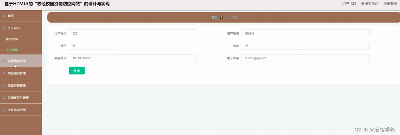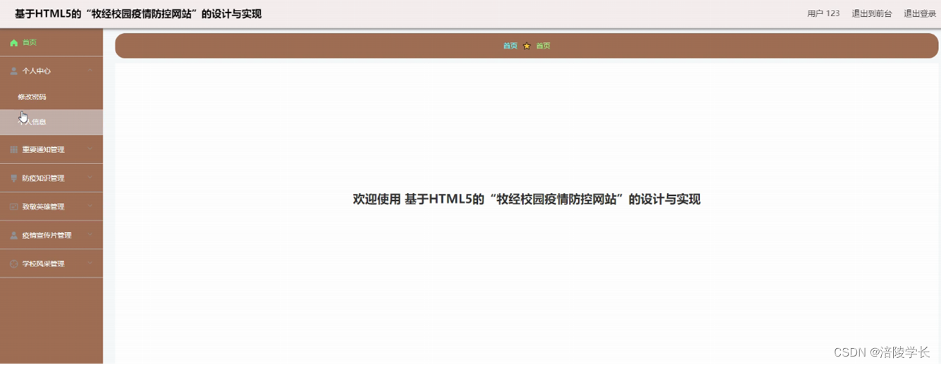 用户登录进入系统后台可以查看首页、个人中心、重要通知管理、防疫知识管理、致敬英雄管理、疫情宣传片管理、学校风采管理等内容,如图5-14所示。