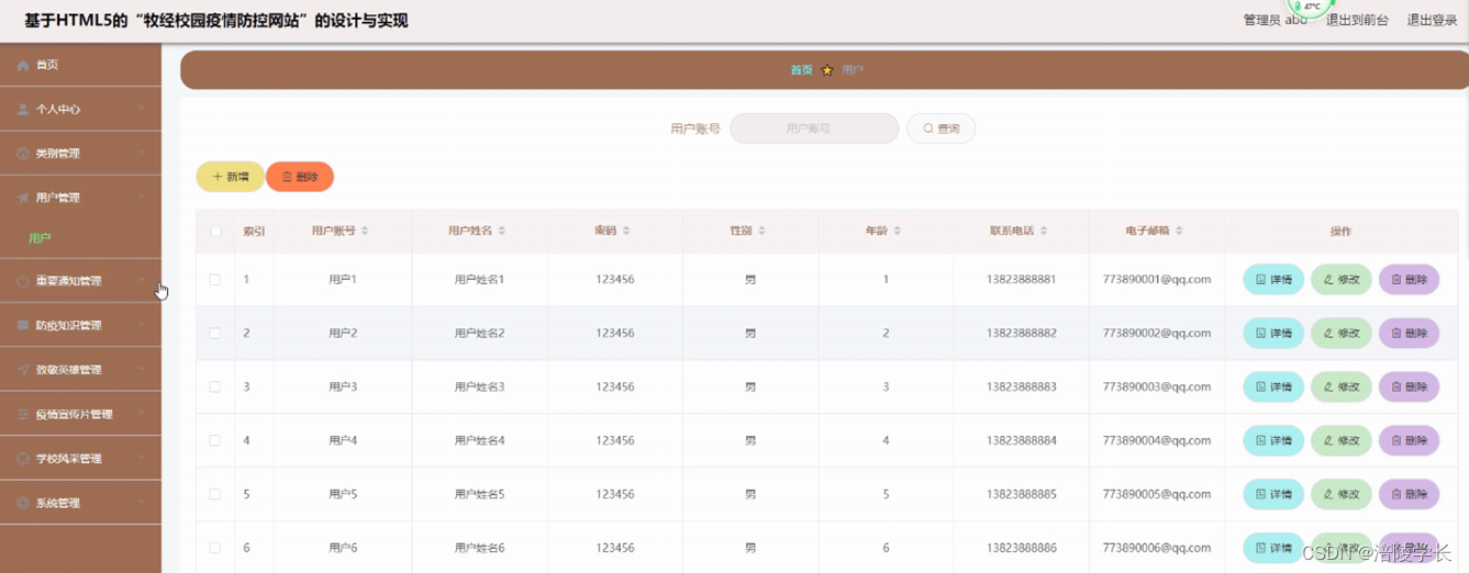 选题背景: 在当前全球范围内疫情的严峻形势下,校园疫情防控成为各个学校和教育机构亟需解决的重要问题。传统的纸质登记和人工管理方式已经无法满足大规模、高效率的疫情防控需求。因此,设计与实现一款基于HTML5的“牧经校园疫情防控网站”具有重要的意义。该网站将通过信息化手段对校园疫情进行全面管理,包括学生健康信息登记、疫情数据统计分析、疫情预警与应急响应等,以提高校园疫情防控的效率和准确性,并为师生提供更安全、健康的学习环境。