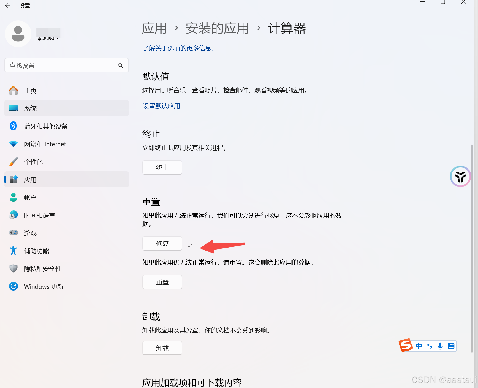 系统设置页——应用——找到计算器——点击修复——等待修复完成
