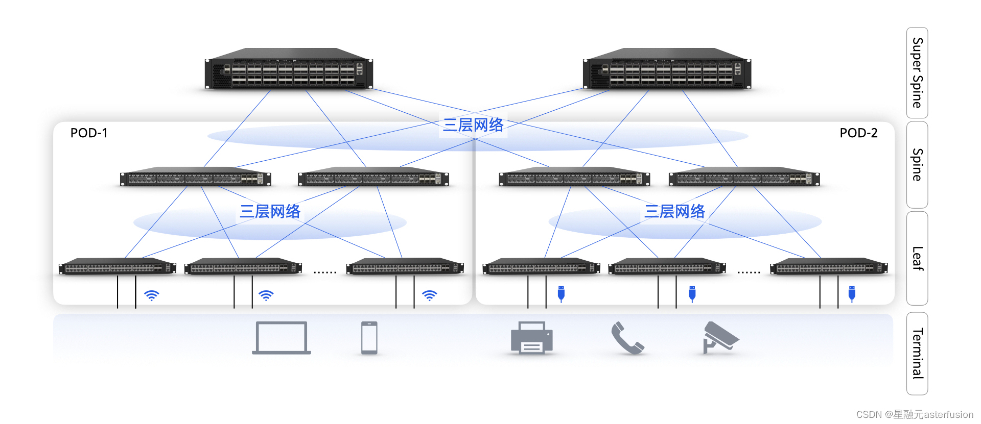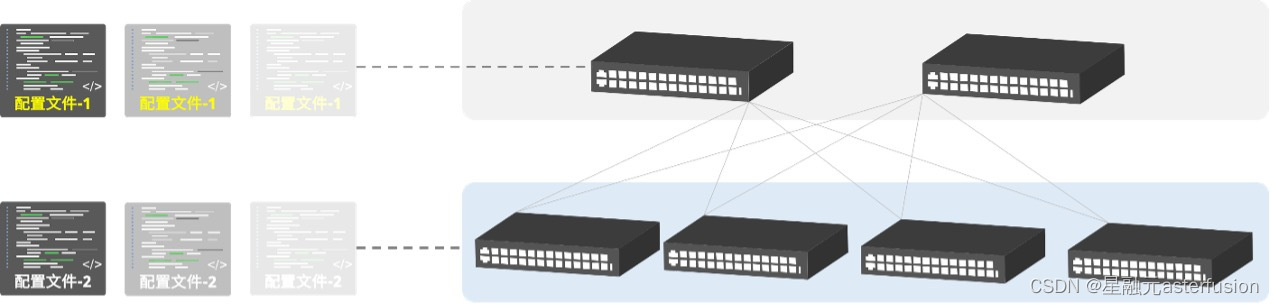云化园区网络架构中,我们将网络设备的配置改进为 “一层设备、一个配置”。网络配置的数量不再被网络设备的总数量所决定,而是只跟网络的层数相关。