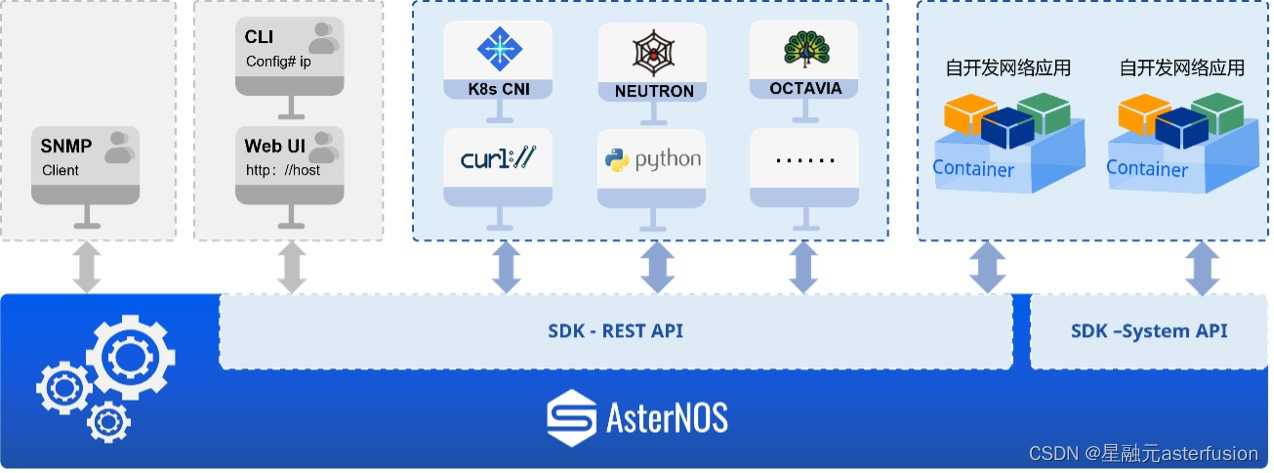 星融元云园区交换机搭载以开源开放的SONiC为内核的自研网络操作系统AsterNOS,其中AsterNOS SDK提供了软件编程接口——使用者除了使用传统的命令行、WebUI进行基础运维之外,还可以通过REST API、System API自动化地、高效地运维网络,甚至开发新应用。让“应用定义网络”成为现实!