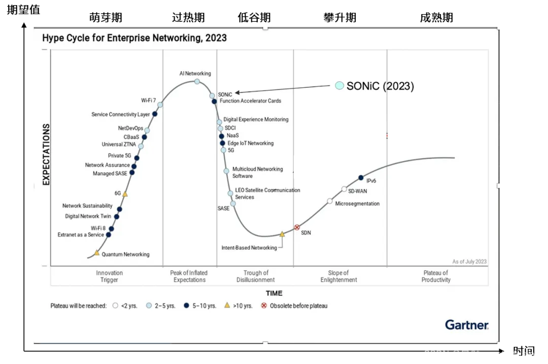 Gartner在2021和2023发布的《Hype Cycle for Enterprise Networking(企业网络技术成熟度曲线)》中,SDN技术因未能引发大量市场兴趣,被归为obsolete“过时”,相较于SDN,SONiC在园区网络建设中如火如荼。随着SONiC的广泛普及,客户可以按需从不同的基于SONiC的服务商获得网络服务,云化园区基于开源SONiC,这和SDN园区方案有着质的区别。