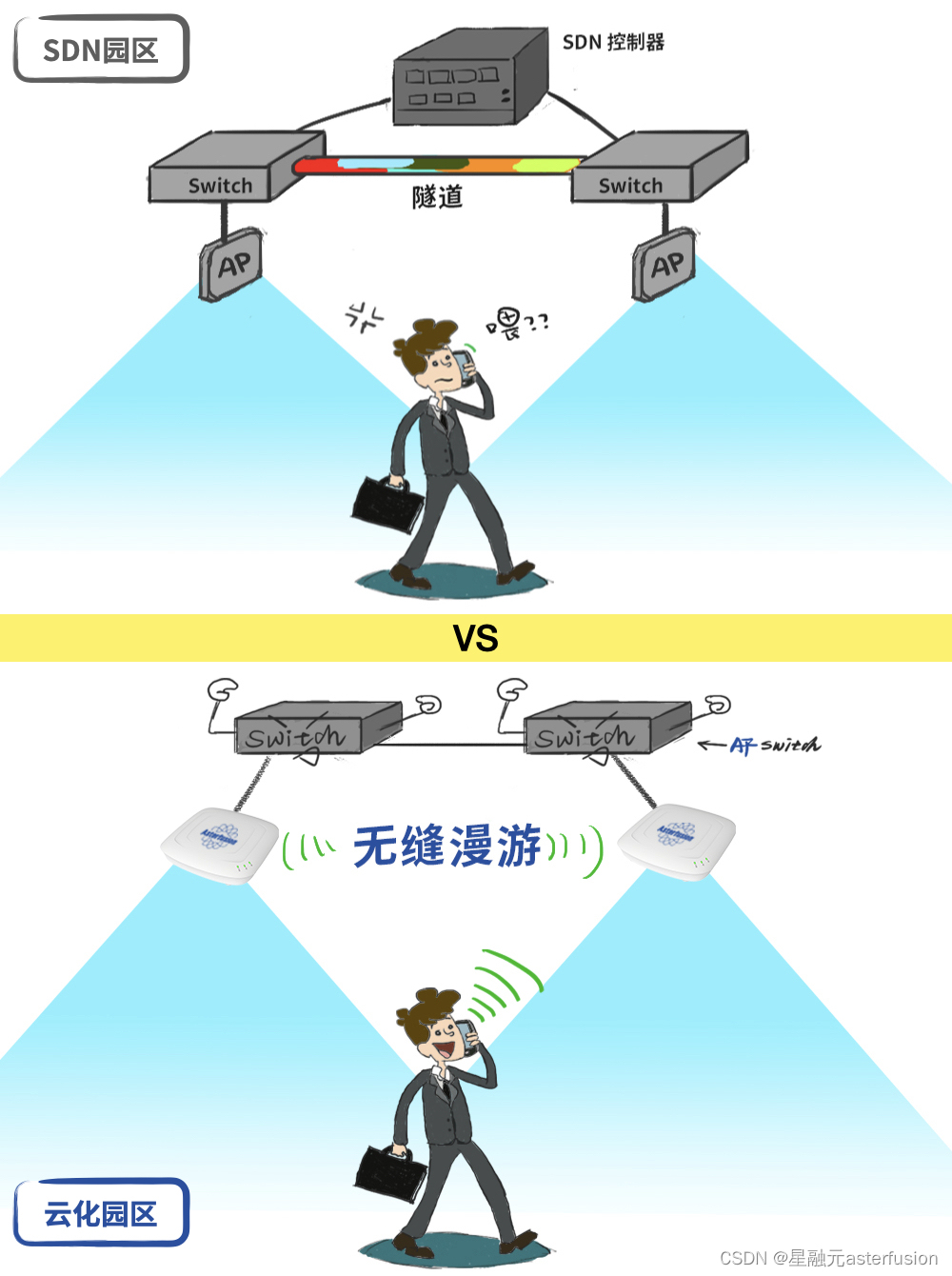 - 云化园区无需控制器,通过交换机组网和配置即可实现网随人动和策略随行,但SDN园区方案需要依赖SDN控制器。