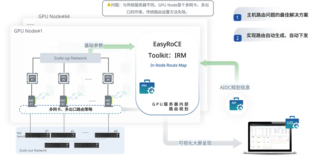 AI智算网络解决方案中包含的EasyRoCE Toolkit – IRM工具(In-Node Route Map,GPU服务器内部路由规划)正是用于解决多网卡路由问题——根据已有的IP地址规划表,自动生成并对集群内所有GPU服务器下发内部路由规划和配置。