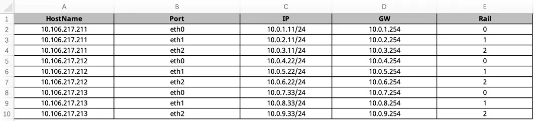 2. 指定需要解析的路由规划信息文件。该文件可在EasyRoCE-AID (AI Infrastructure Descriptor,AI基础设施蓝图规划)工具引导下手动填写,形式为下图所示的excel表格,主要包含IP和接口地址规划、Rail平面划分等构造智算网络的必备信息;