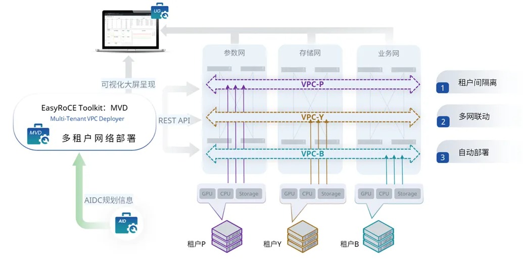 想分享一款用于多租户网络的配置工具:EasyRoCE-MVD(Multi-Tenant VPC Deployer )。MVD能帮助用户快速实现租户隔离,参数、存储、业务的多网联动和自动化部署。
