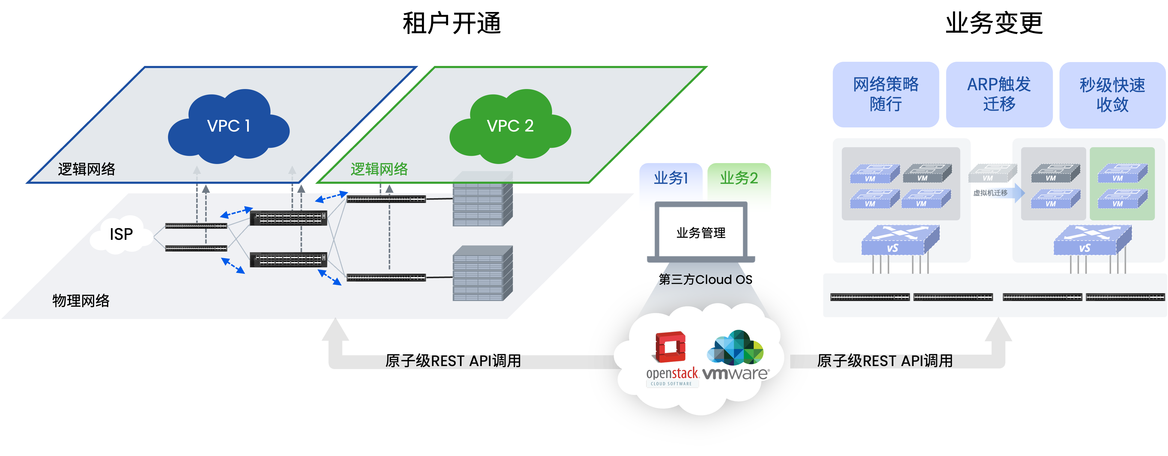 通过BGP EVPN为不同租户构建独立的虚拟网络,支持灵活的业务扩展。