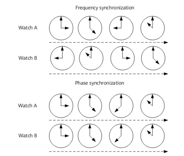 - 频率同步(Frequency Synchronization):从节点调整频率与主节点一致,保持恒定相位差。