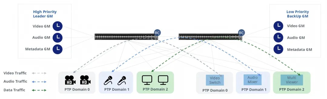 图示为一个典型的广播媒体网络,采用星融元PTP交换机构建多PTP域与冗余时钟源(主备自动切换),为音视频分配独立域号,实现全网20ns同步精度,保障音视频流与其他数据流量无缝对齐。