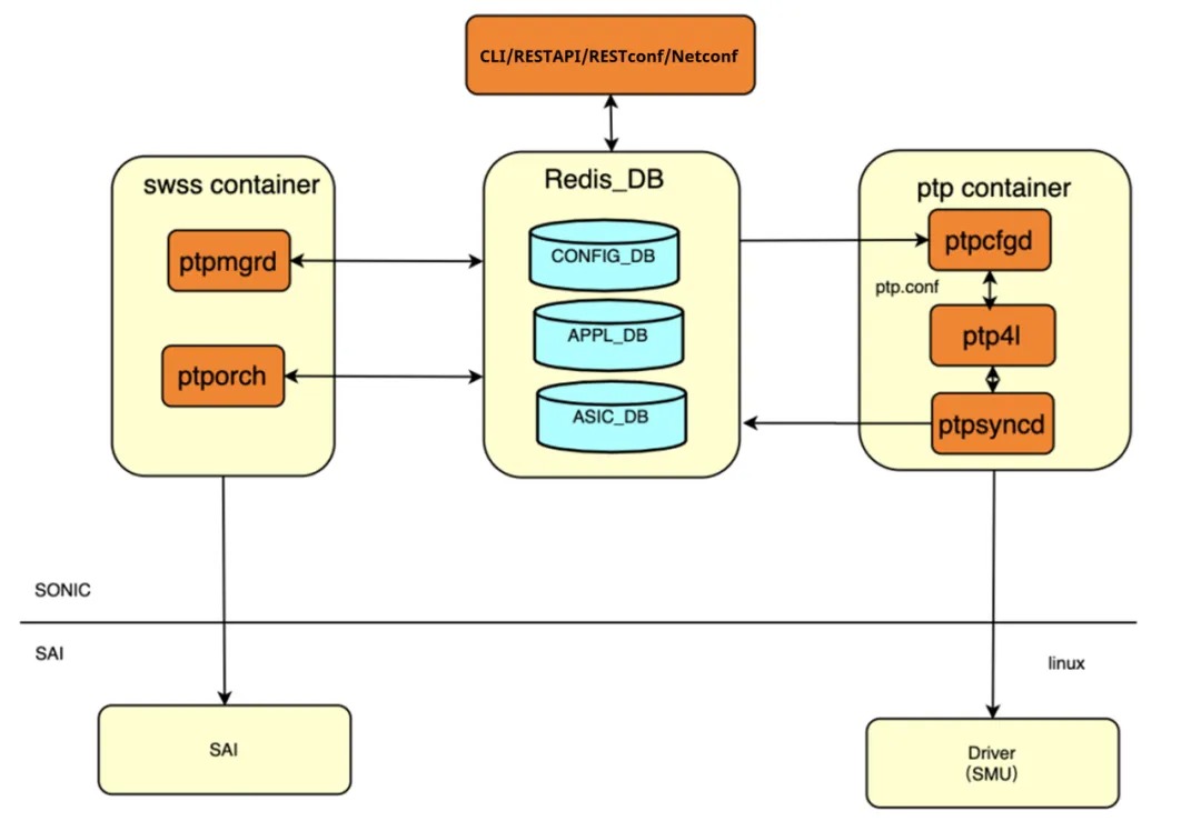 AsterNOS 的PTP子系统集成 LinuxPTP / ptp4l,并与 RedisDB 和底层硬件驱动高效交互,支持 RESTful API、RESTconf、Netconf 等多种管理协议,提供优异的系统集成与互操作能力。