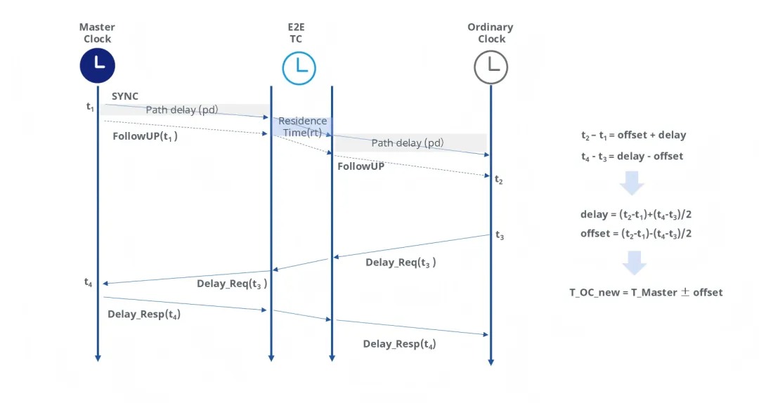 端到端(End-to-End, E2E)机制下,中间设备(E2E TC)在转发报文时会添加驻留时间(rt),通过双向报文交换计算整条路径的总延迟。