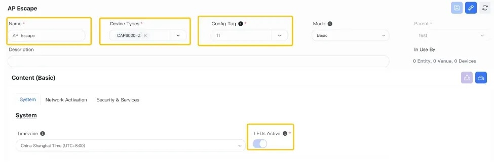 在此模板下新建配置,设置模板名称、对应的 AP 型号、配置标签、系统时区及LED。