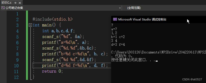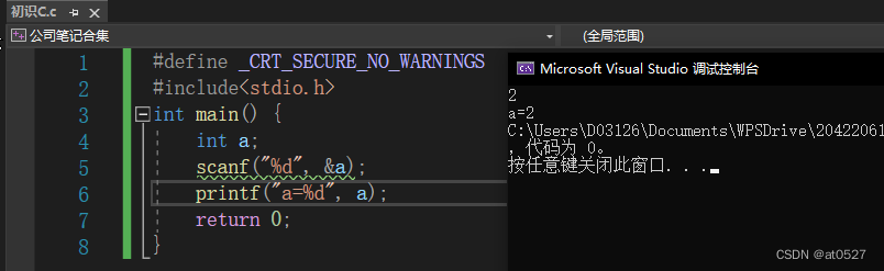 注:VS编译器不能识别scanf函数,需要在头部声明:或者使用scanf_s(VS提供)