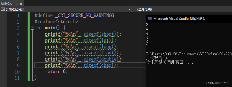 sizeof():操作符,用来计算对象或者类型的大小,会返回一个内存所占字节数(整型);