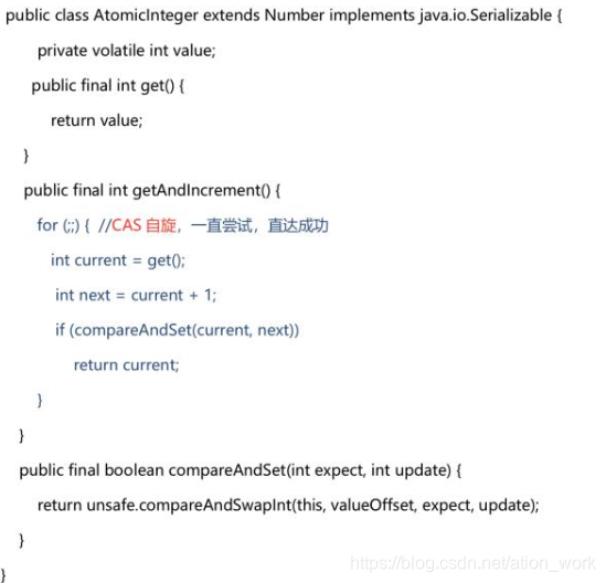 JDK1.5 的原子包:java.util.concurrent.atomic 这个包里面提供了一组原子类。其基本的特性就是在多线程环境下,当有多个线程同时执行这些类的实例包含的方法时,具有排他性,即当某个线程进入方法,执行其中的指令时,不会被其他线程打断,而别的线程就像自旋锁一样,一直等到该方法执行完成,才由 JVM 从等待队列中选择一个另一个线程进入,这只是一种逻辑上的理解。